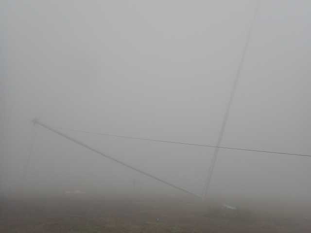 風況マストのチルトアップ五里霧中2025年10月21日2025年10月21日らりらりギャラリー チルトアップは濃霧の中、慎重に進められ、だいぶ鉛直に近くなってきましたが、よく見えません。タワーの下半分ぐらいが見える状態です。